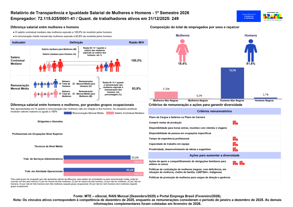 Nesse sentido, apresentamos o Relatório de Transparência Salarial referente ao período atual, com o intuito de fornecer informações claras e acessíveis sobre a remuneração de nossos colaboradores.